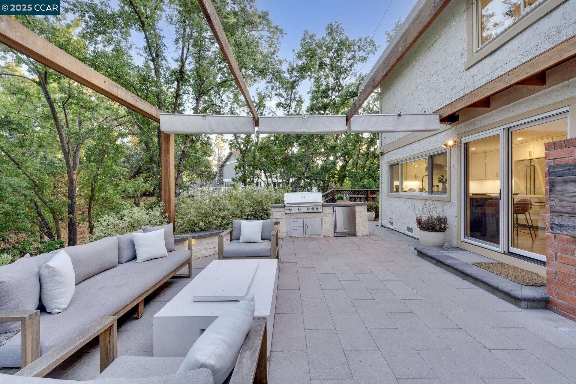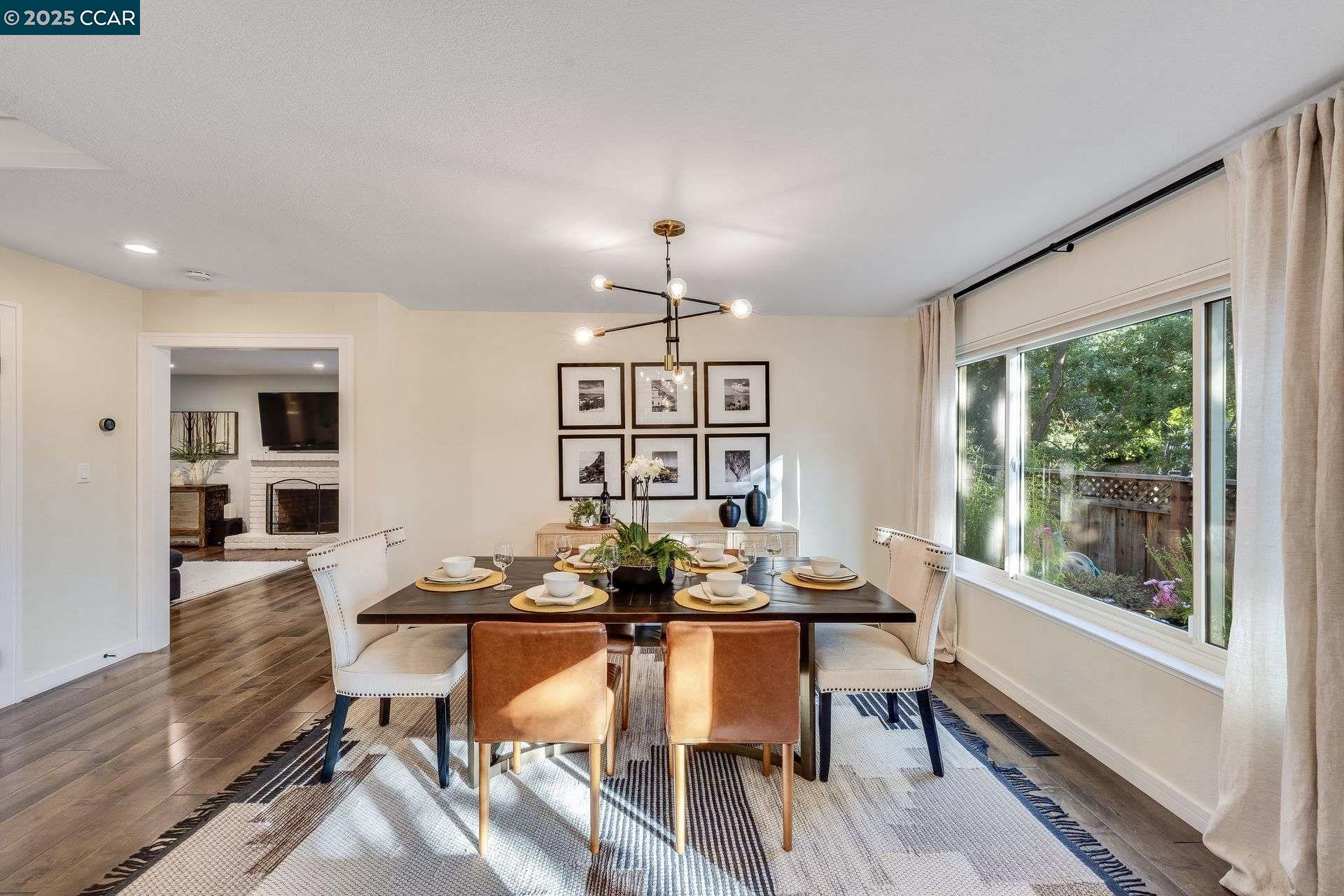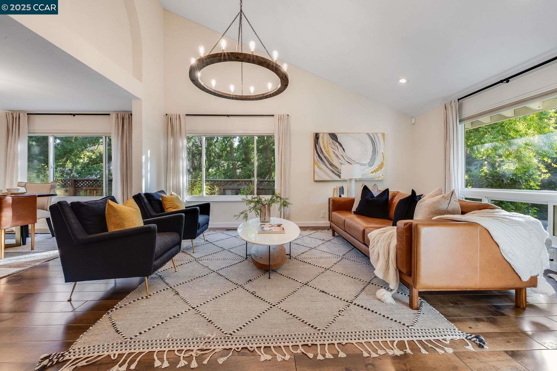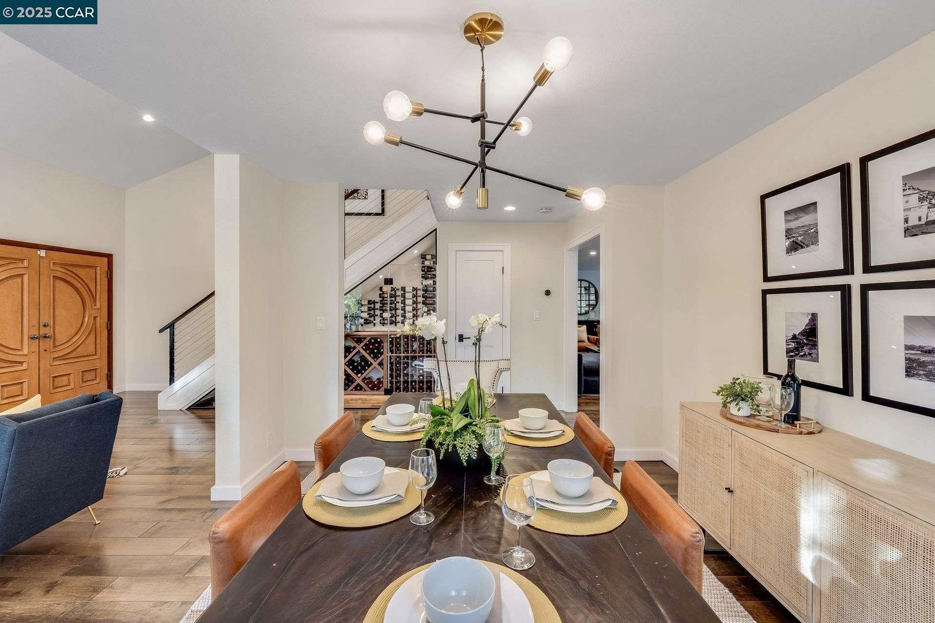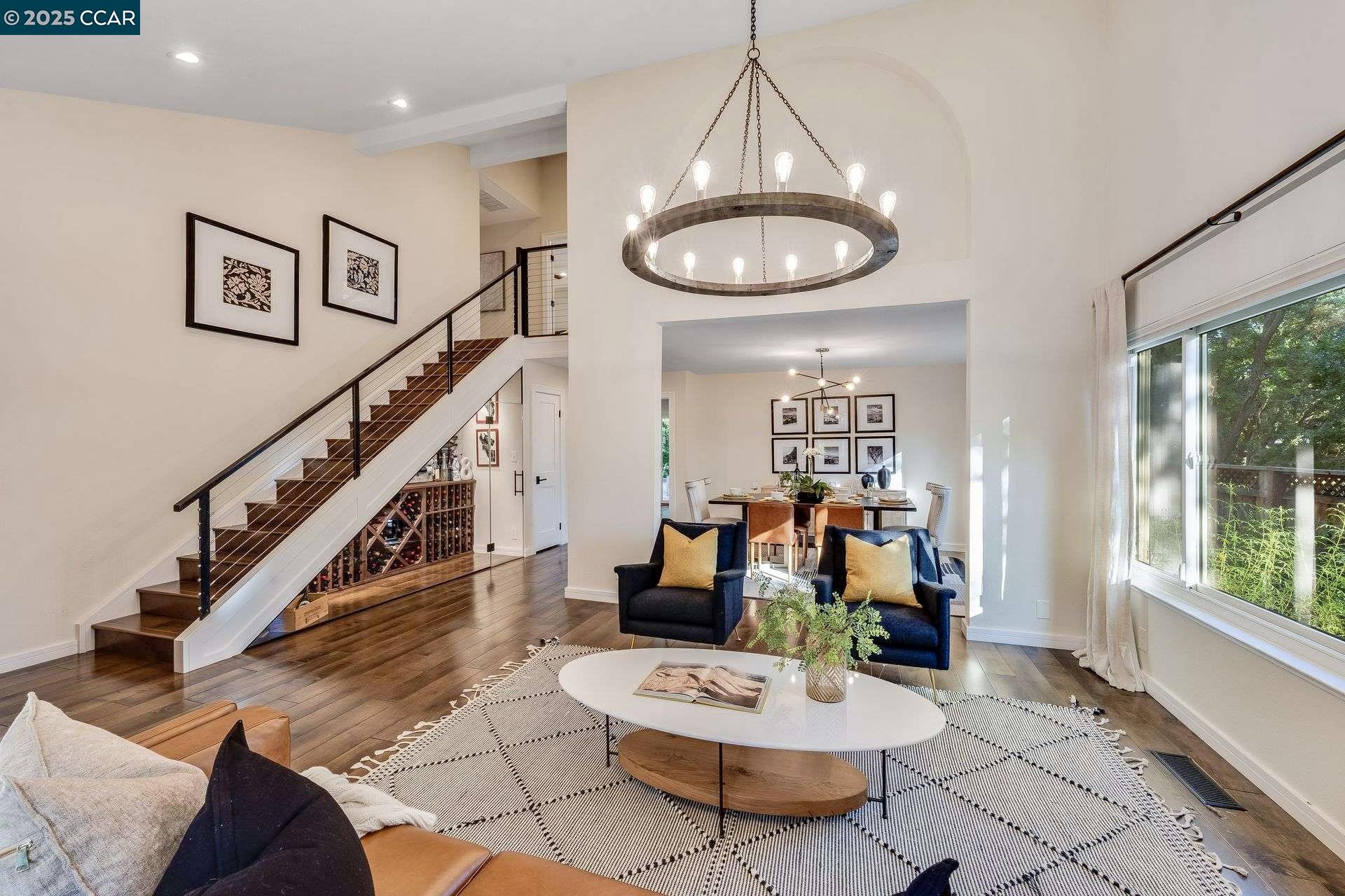 Beautiful new listing in Rudgear Meadows! No expense spared on this highly updated home that includes owned solar. Stylish Modern kitchen that features quartz counters w/tile backsplash, SS appliances, gas range, recessed lighting, under cabinet lighting & breakfast bar. The adjacent family room w/hardwood floors, recessed lighting & wood burning fireplace. The light filled formal living & dining room feature vaulted ceilings, recessed lighting, engineered wood floors & an amazing Napa inspired custom temperature-controlled wine cellar. A spacious primary bedroom w/double door entry, recessed lighting, ceiling fan & full bathroom w/dual sink vanities, walk-in closet & stall shower. There are 3 additional bedrooms & a beautifully remodeled bathroom w/two sinks & shower over bathtub. A fabulous entertainer's backyard has an outdoor grill, fire pit, custom covered patio, garden, lawn area & mini sport court all overlooking the open space & trails! So many great features that include a metal roof, owned solar, finished 3 car garage, whole house fan, dual pane windows, Central A/C, laundry room & downstairs 1/2 bath. Excellent Cul-de-sac location, adjacent to walking trails, Rudgear Meadows Pool & Rudgear park. Walnut Creek schools & Acalanes school district.