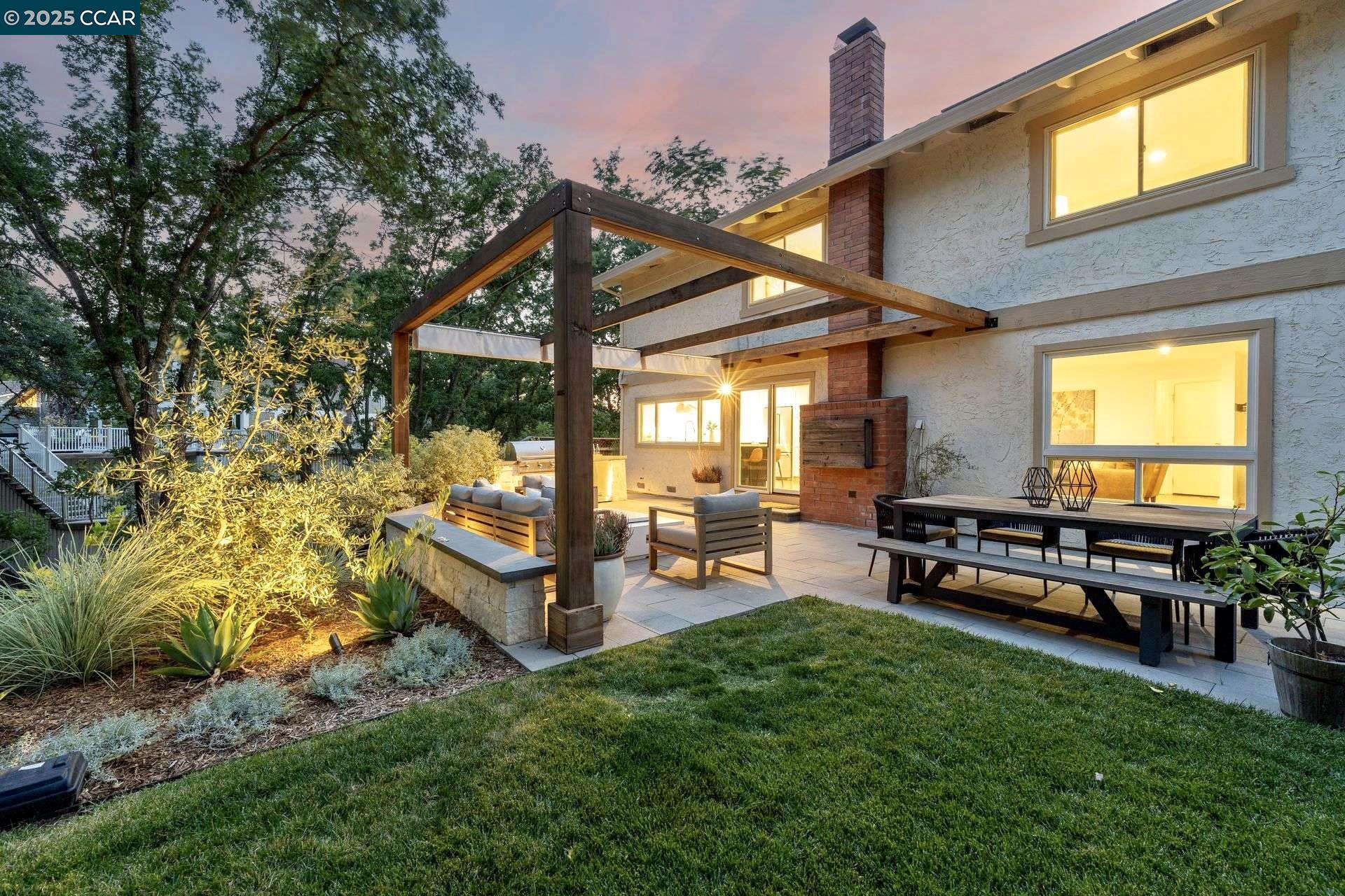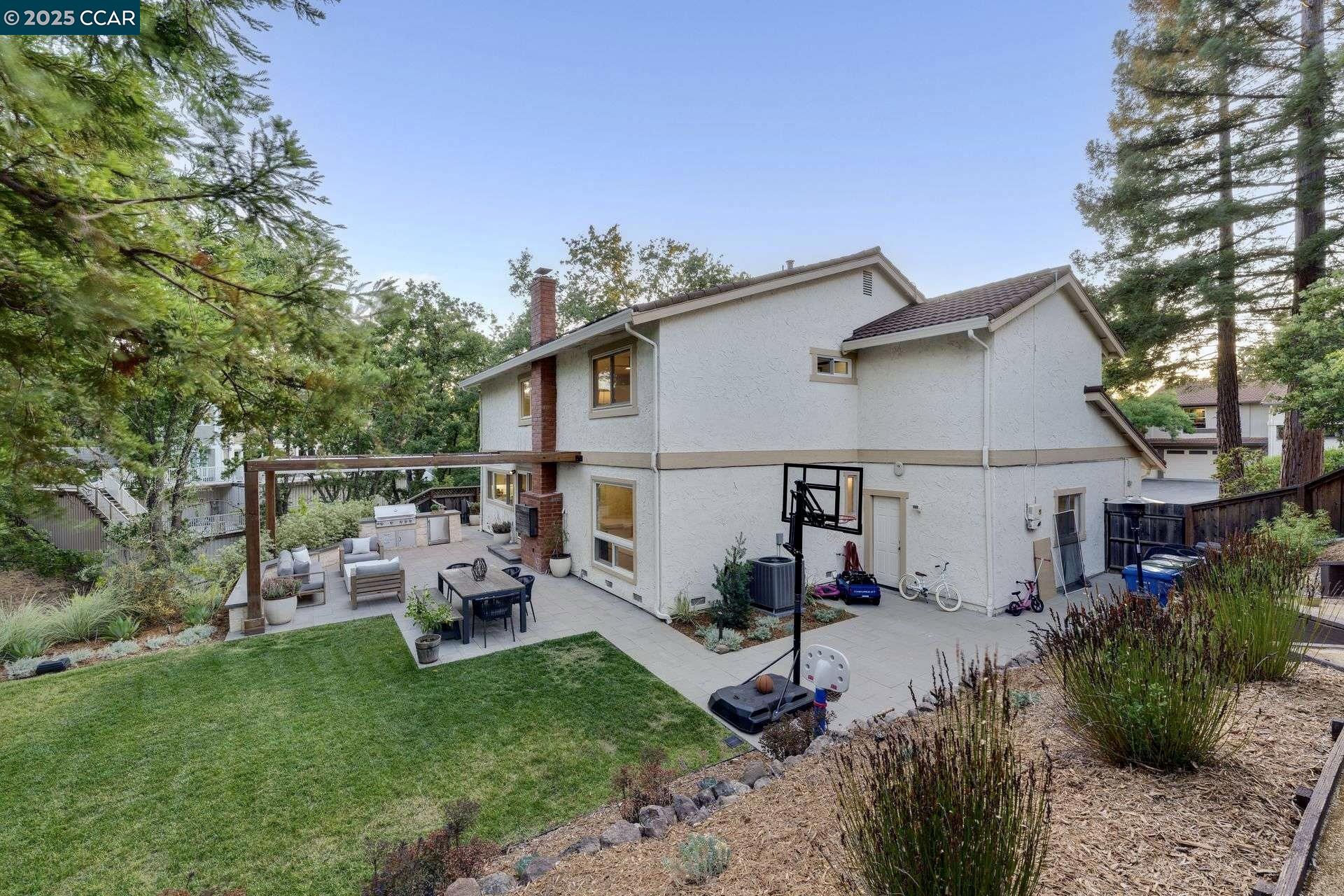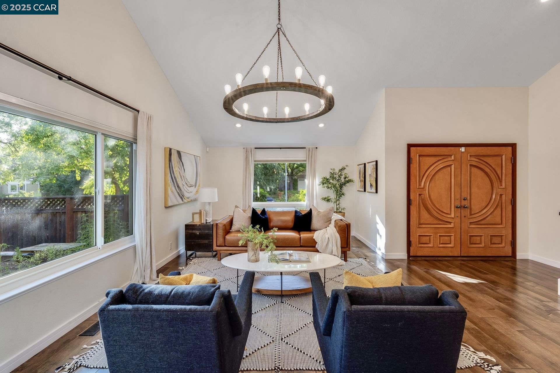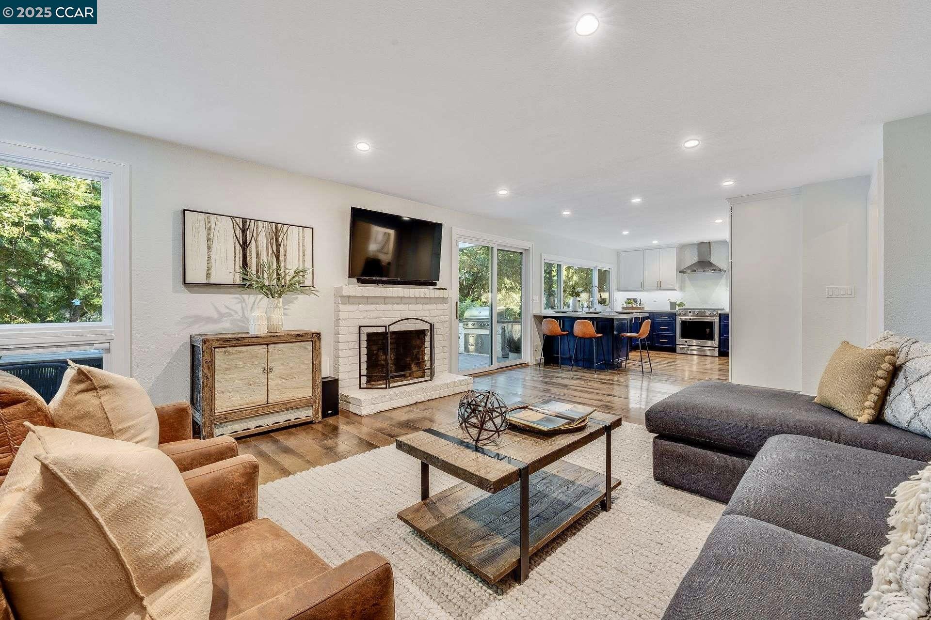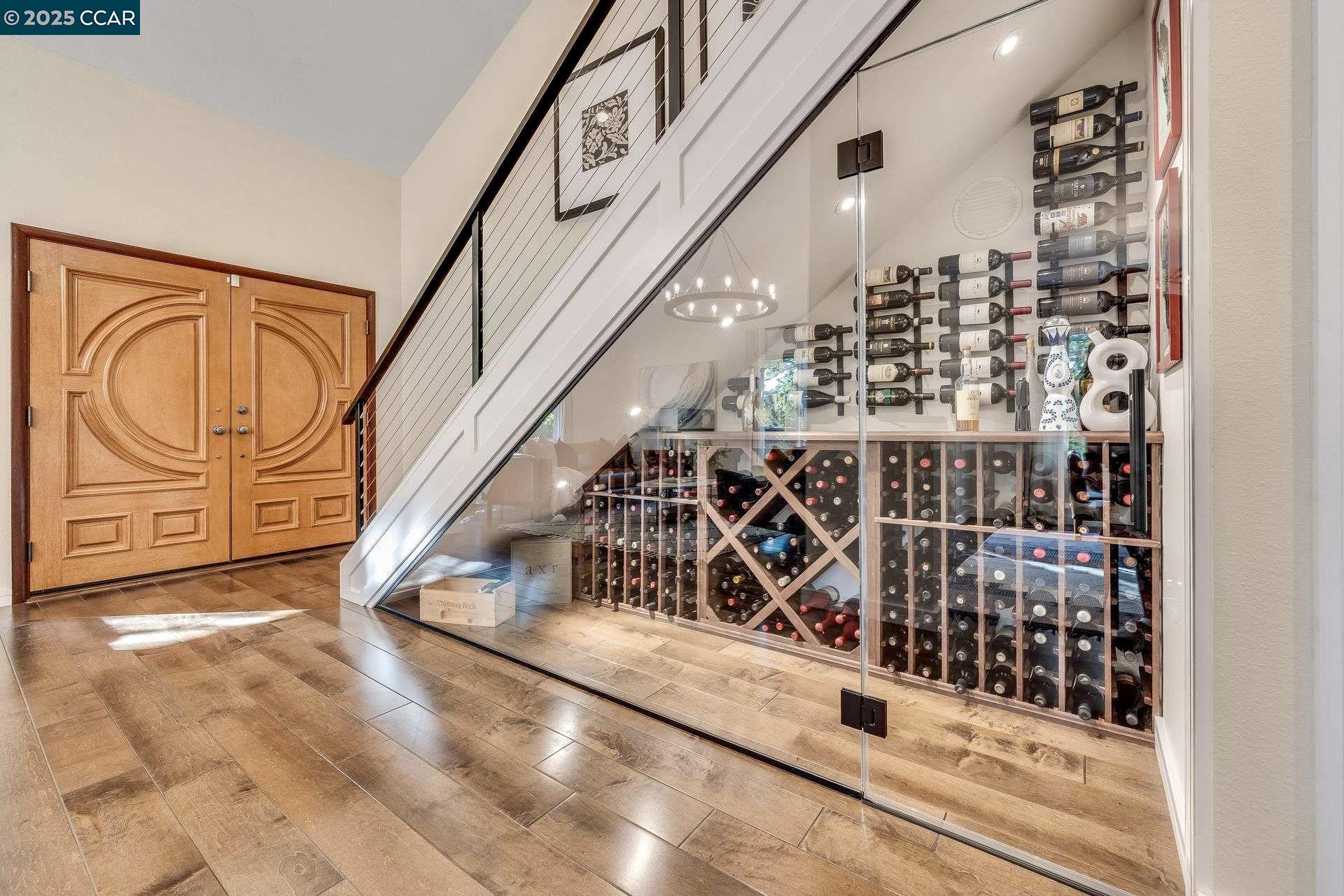Beautiful new listing in Rudgear Meadows! No expense spared on this highly updated home that includes owned solar. Stylish Modern kitchen that features quartz counters w/tile backsplash, SS appliances, gas range, recessed lighting, under cabinet lighting & breakfast bar. The adjacent family room w/hardwood floors, recessed lighting & wood burning fireplace. The light filled formal living & dining room feature vaulted ceilings, recessed lighting, engineered wood floors & an amazing Napa inspired custom temperature-controlled wine cellar. A spacious primary bedroom w/double door entry, recessed lighting, ceiling fan & full bathroom w/dual sink vanities, walk-in closet & stall shower. There are 3 additional bedrooms & a beautifully remodeled bathroom w/two sinks & shower over bathtub. A fabulous entertainer's backyard has an outdoor grill, fire pit, custom covered patio, garden, lawn area & mini sport court all overlooking the open space & trails! So many great features that include a metal roof, owned solar, finished 3 car garage, whole house fan, dual pane windows, Central A/C, laundry room & downstairs 1/2 bath. Excellent Cul-de-sac location, adjacent to walking trails, Rudgear Meadows Pool & Rudgear park. Walnut Creek schools & Acalanes school district.