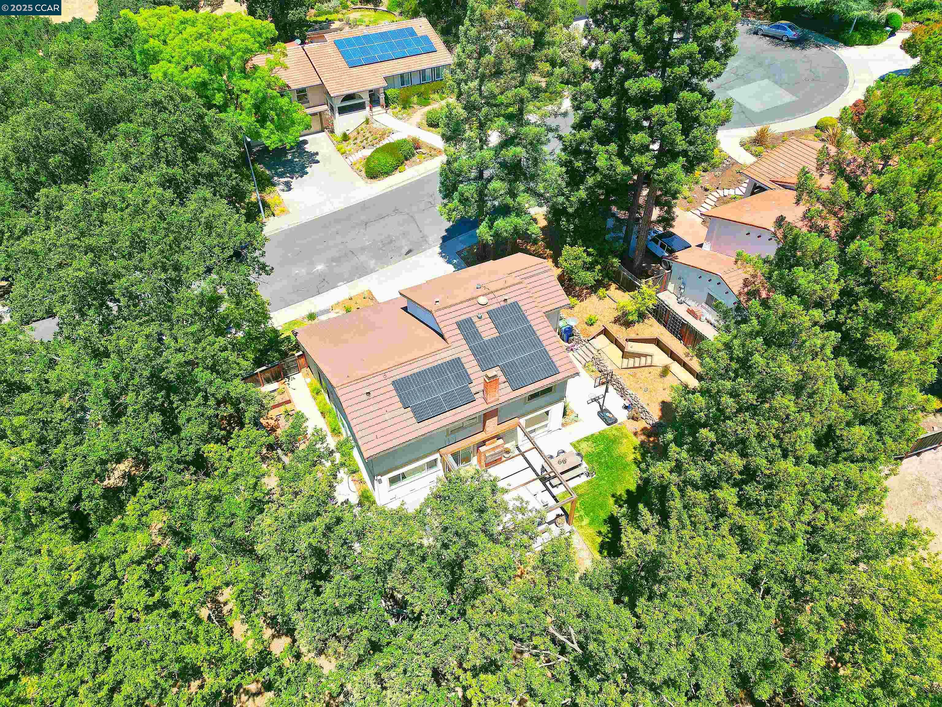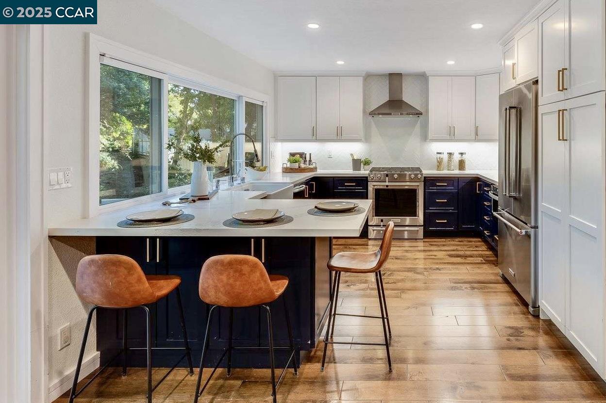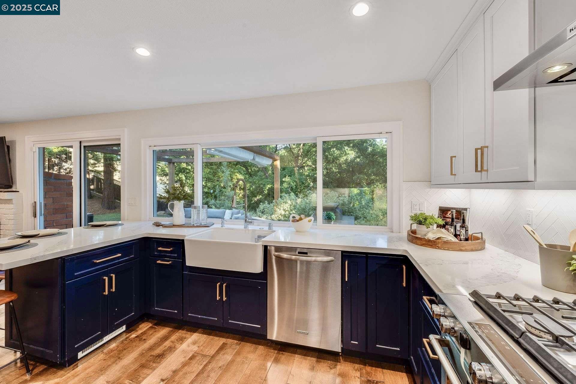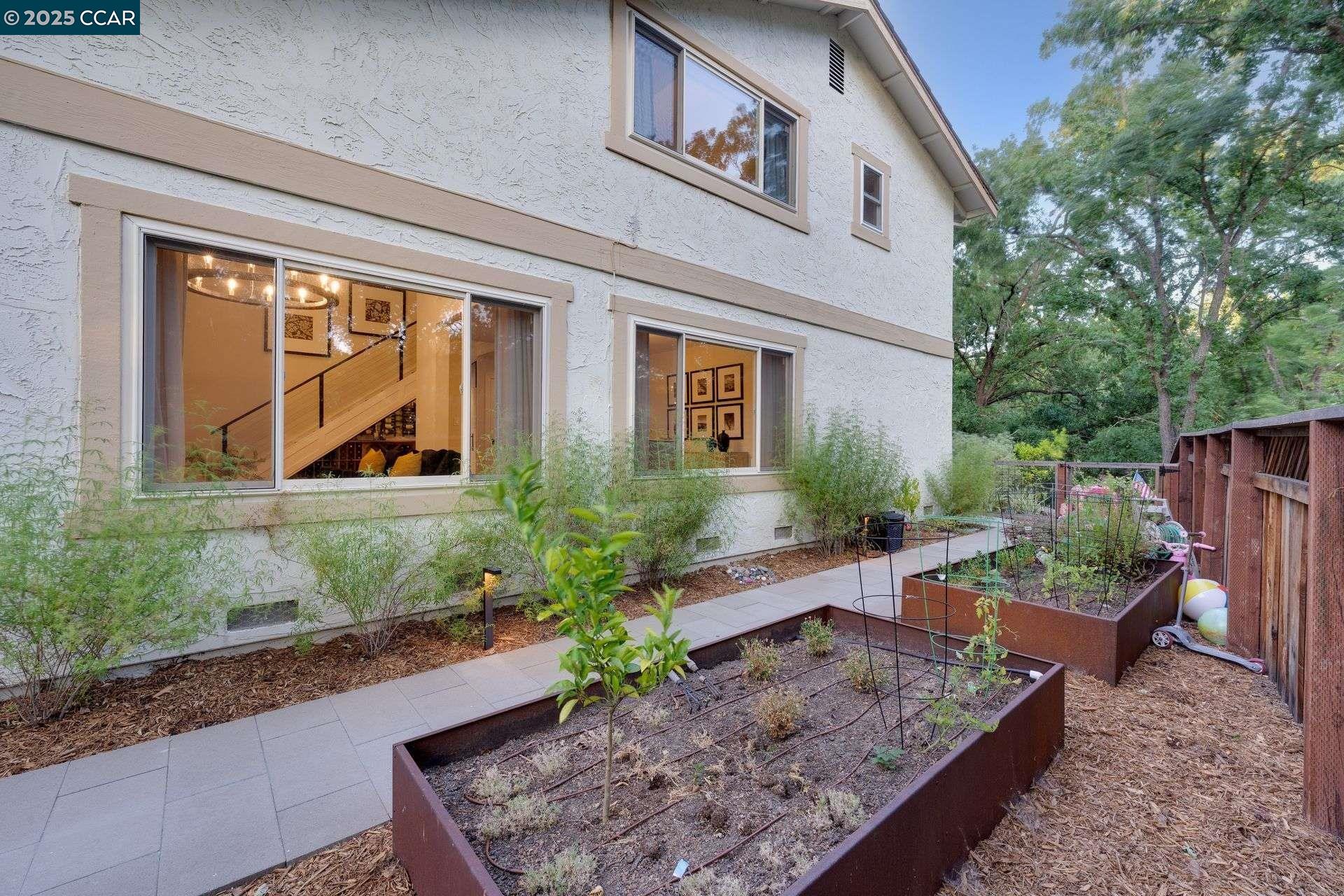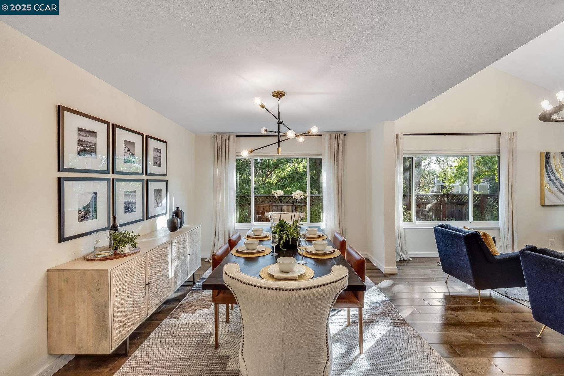 Beautiful new listing in Rudgear Meadows! No expense spared on this highly updated home that includes owned solar. Stylish Modern kitchen that features quartz counters w/tile backsplash, SS appliances, gas range, recessed lighting, under cabinet lighting & breakfast bar. The adjacent family room w/hardwood floors, recessed lighting & wood burning fireplace. The light filled formal living & dining room feature vaulted ceilings, recessed lighting, engineered wood floors & an amazing Napa inspired custom temperature-controlled wine cellar. A spacious primary bedroom w/double door entry, recessed lighting, ceiling fan & full bathroom w/dual sink vanities, walk-in closet & stall shower. There are 3 additional bedrooms & a beautifully remodeled bathroom w/two sinks & shower over bathtub. A fabulous entertainer's backyard has an outdoor grill, fire pit, custom covered patio, garden, lawn area & mini sport court all overlooking the open space & trails! So many great features that include a metal roof, owned solar, finished 3 car garage, whole house fan, dual pane windows, Central A/C, laundry room & downstairs 1/2 bath. Excellent Cul-de-sac location, adjacent to walking trails, Rudgear Meadows Pool & Rudgear park. Walnut Creek schools & Acalanes school district.