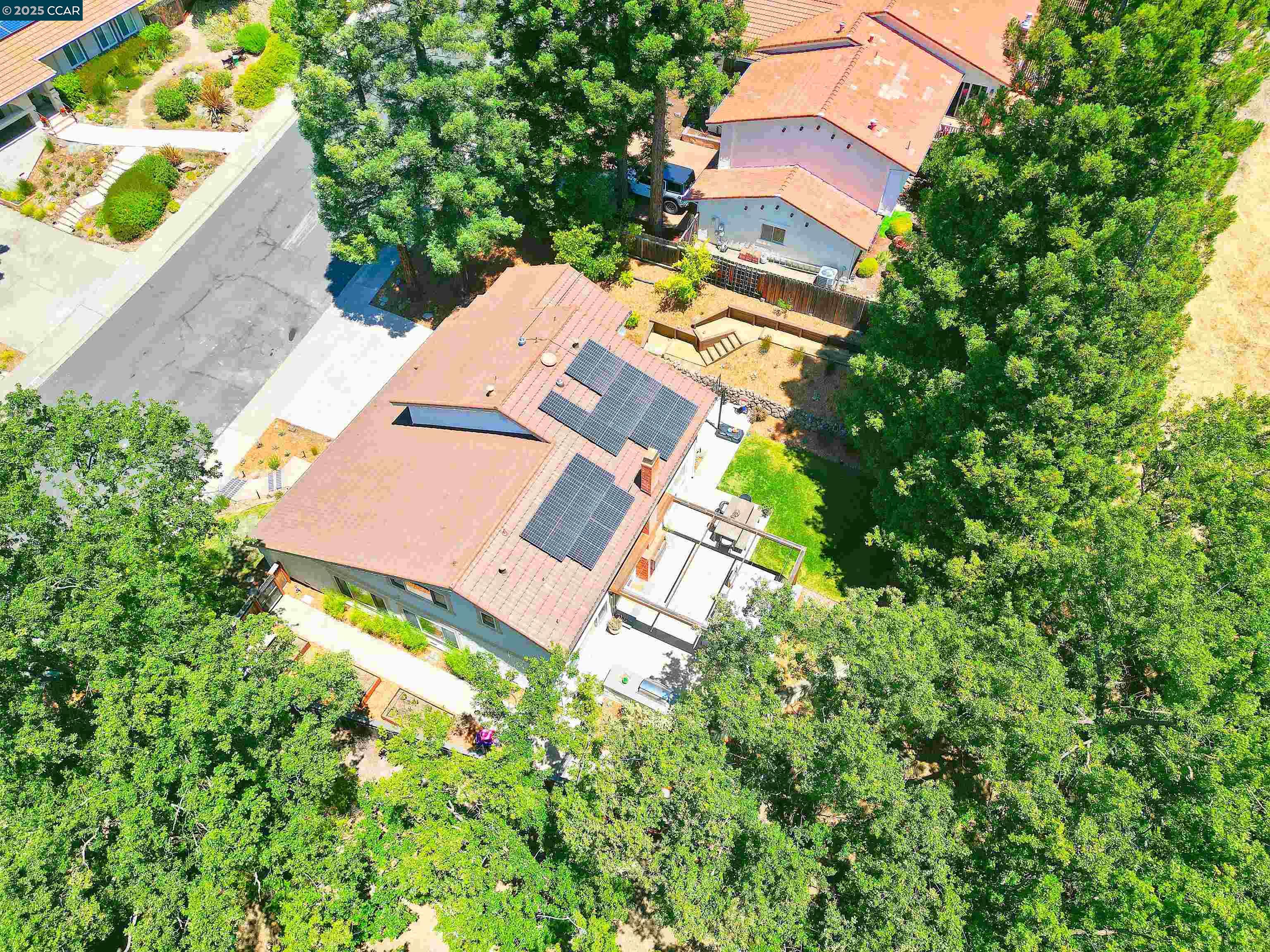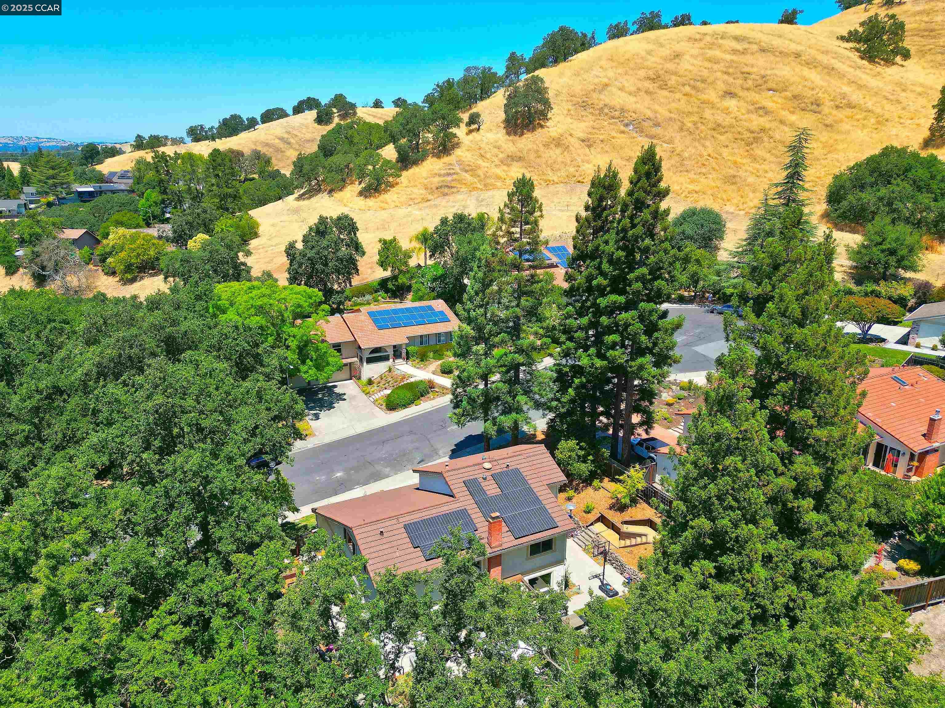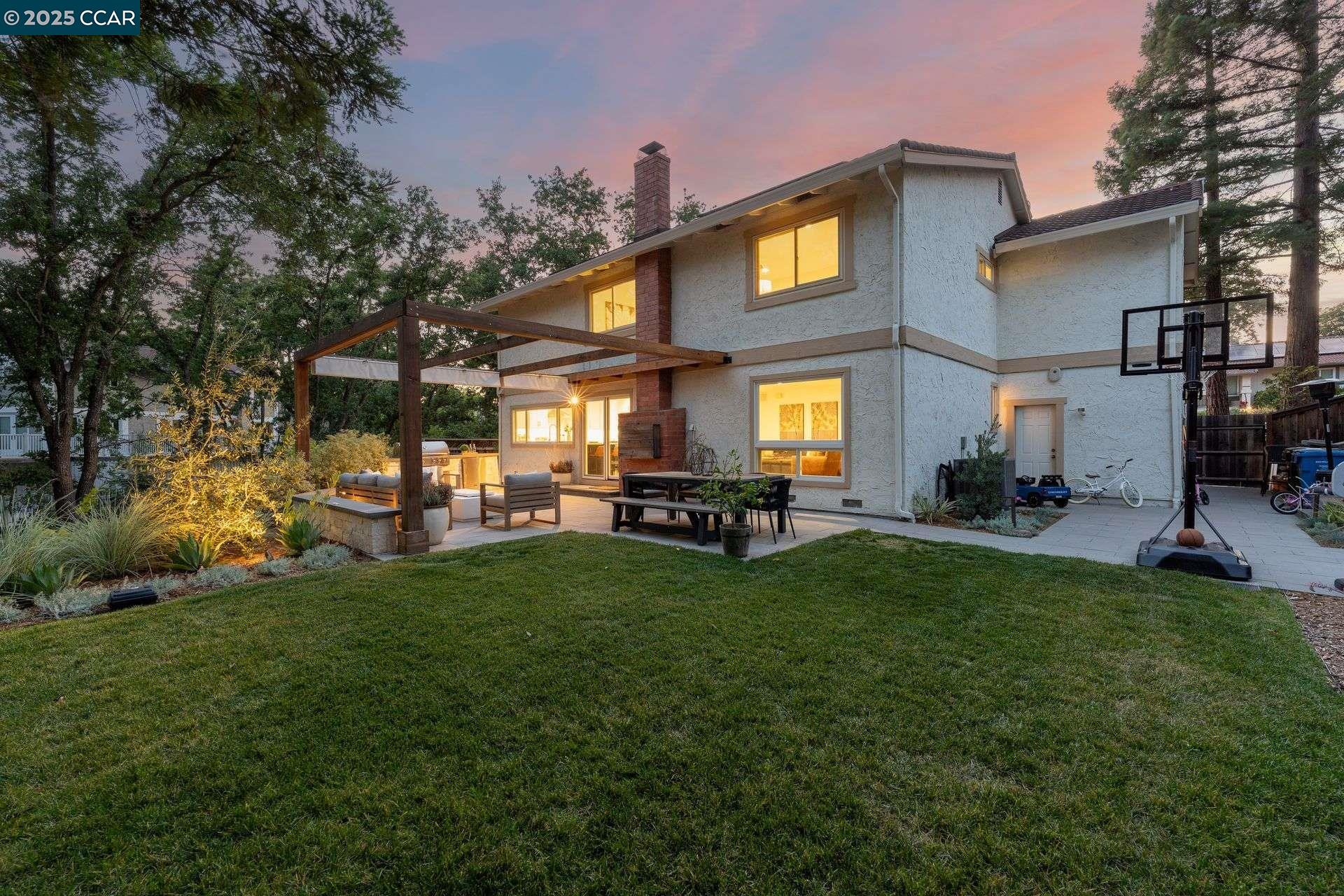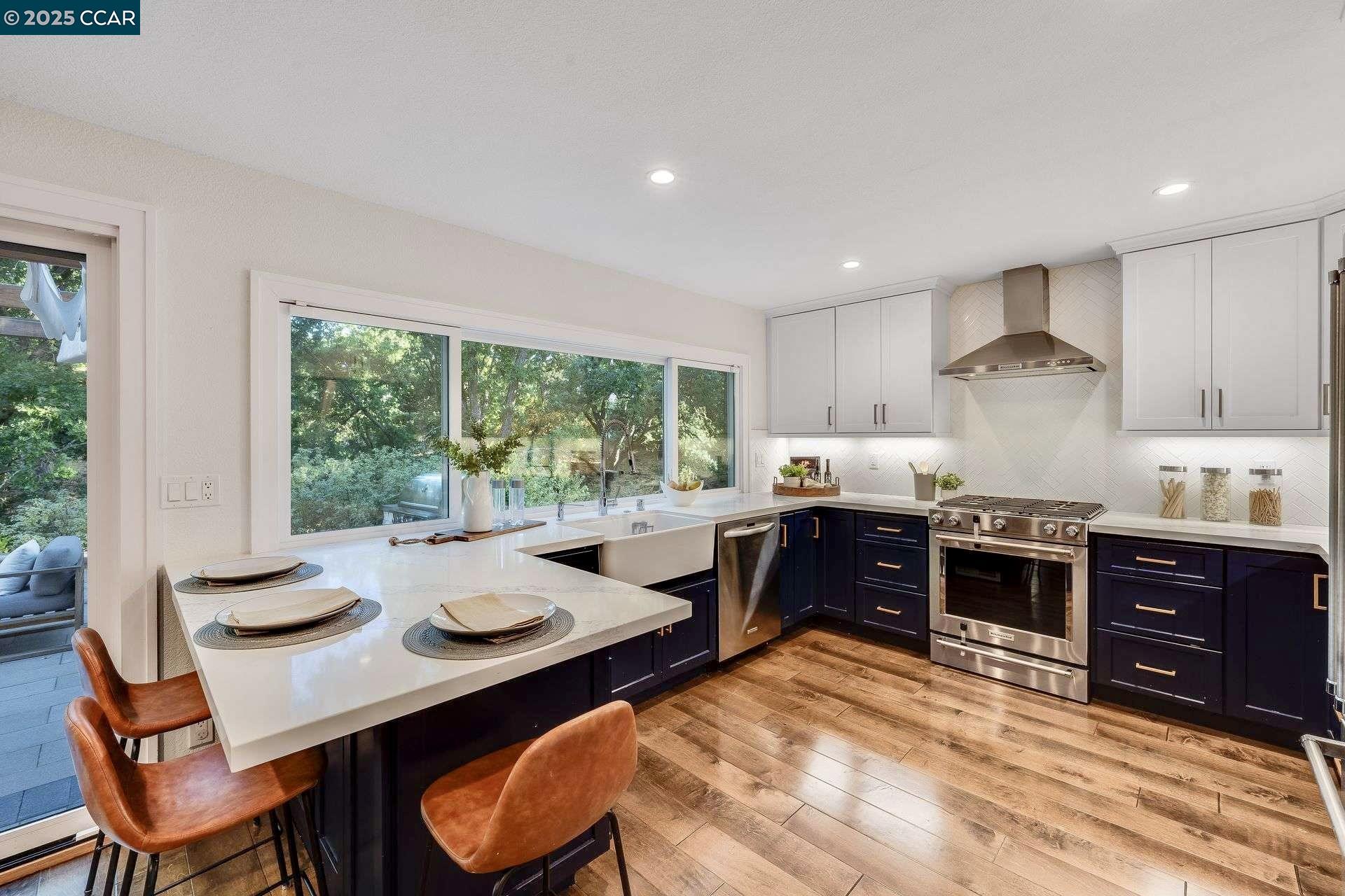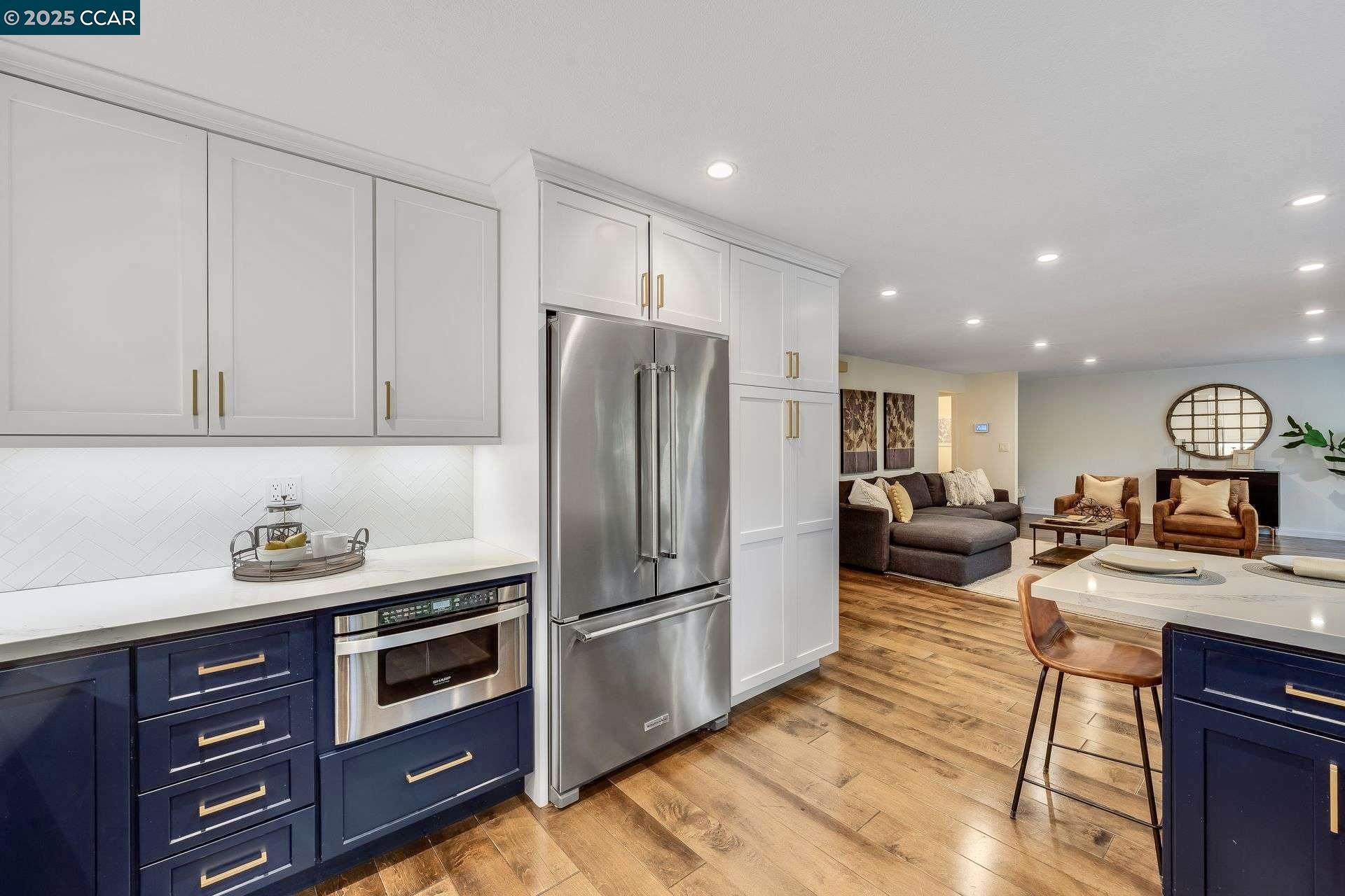 Beautiful new listing in Rudgear Meadows! No expense spared on this highly updated home that includes owned solar. Stylish Modern kitchen that features quartz counters w/tile backsplash, SS appliances, gas range, recessed lighting, under cabinet lighting & breakfast bar. The adjacent family room w/hardwood floors, recessed lighting & wood burning fireplace. The light filled formal living & dining room feature vaulted ceilings, recessed lighting, engineered wood floors & an amazing Napa inspired custom temperature-controlled wine cellar. A spacious primary bedroom w/double door entry, recessed lighting, ceiling fan & full bathroom w/dual sink vanities, walk-in closet & stall shower. There are 3 additional bedrooms & a beautifully remodeled bathroom w/two sinks & shower over bathtub. A fabulous entertainer's backyard has an outdoor grill, fire pit, custom covered patio, garden, lawn area & mini sport court all overlooking the open space & trails! So many great features that include a metal roof, owned solar, finished 3 car garage, whole house fan, dual pane windows, Central A/C, laundry room & downstairs 1/2 bath. Excellent Cul-de-sac location, adjacent to walking trails, Rudgear Meadows Pool & Rudgear park. Walnut Creek schools & Acalanes school district.