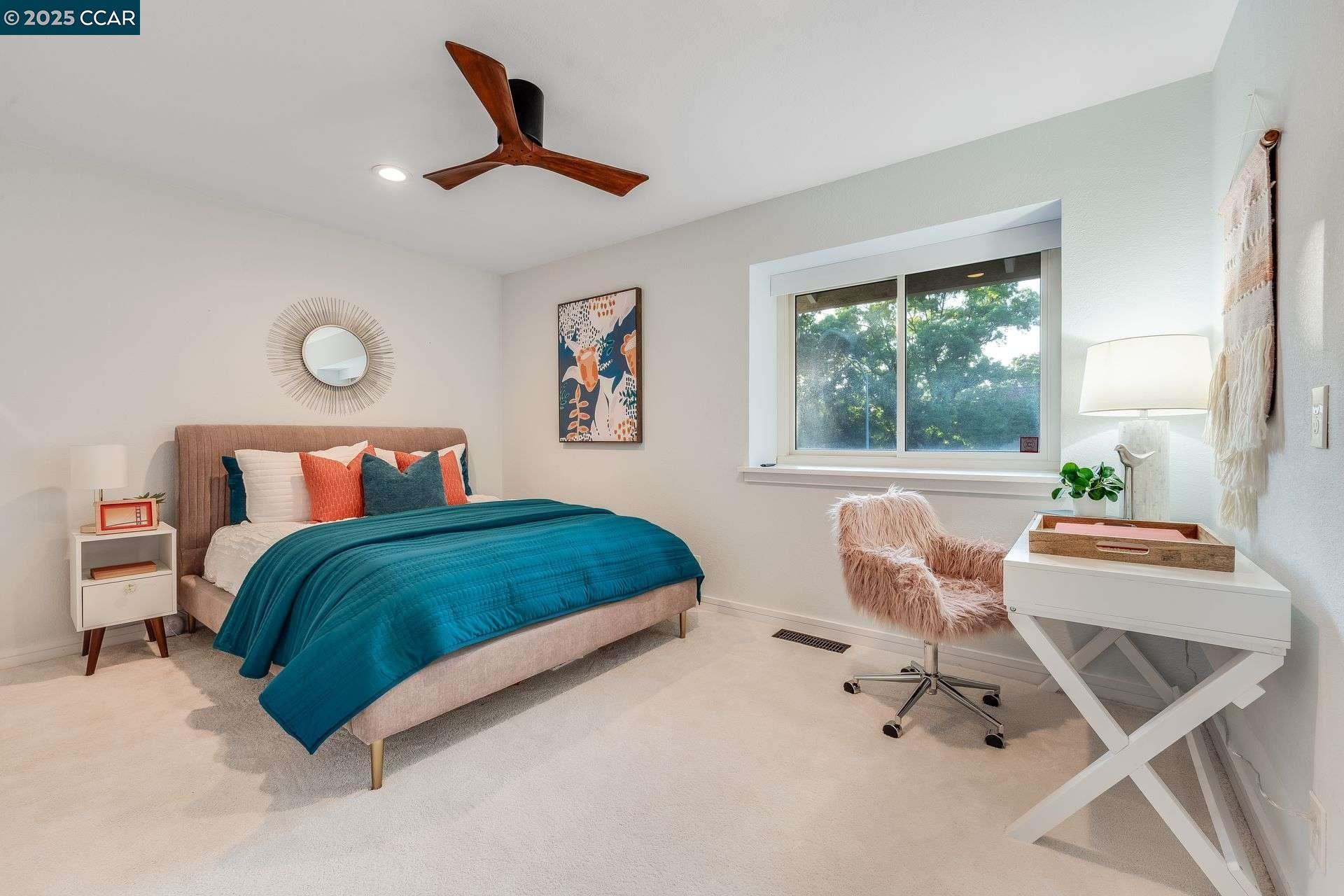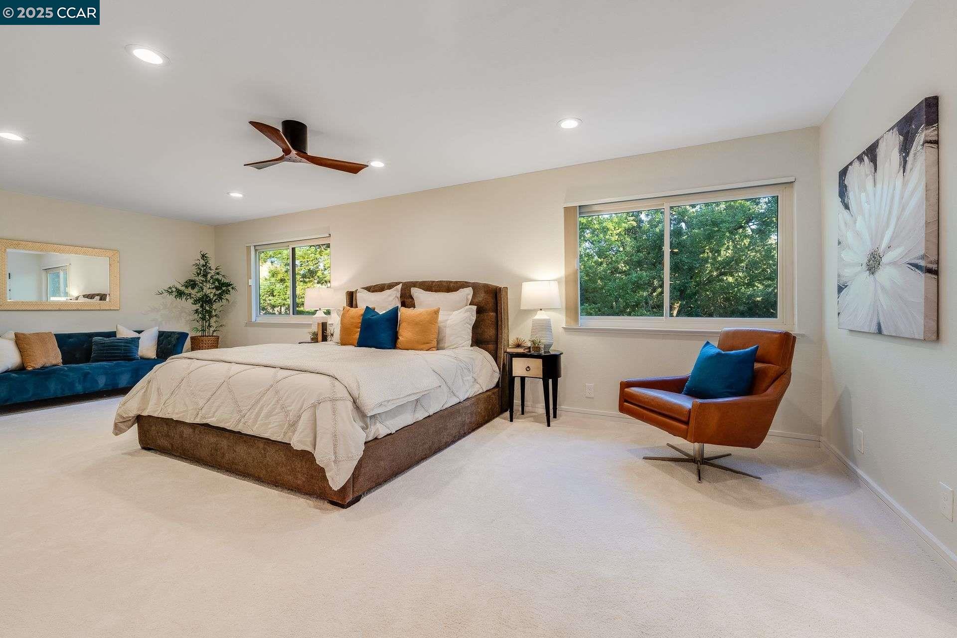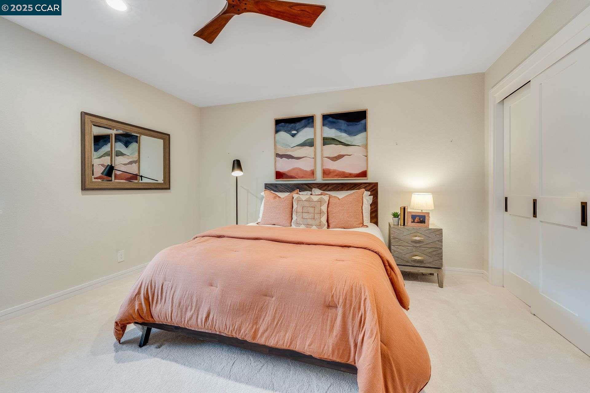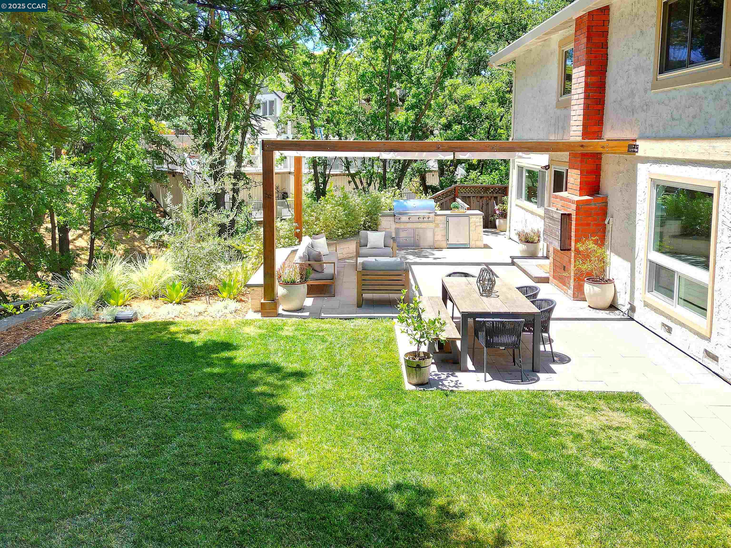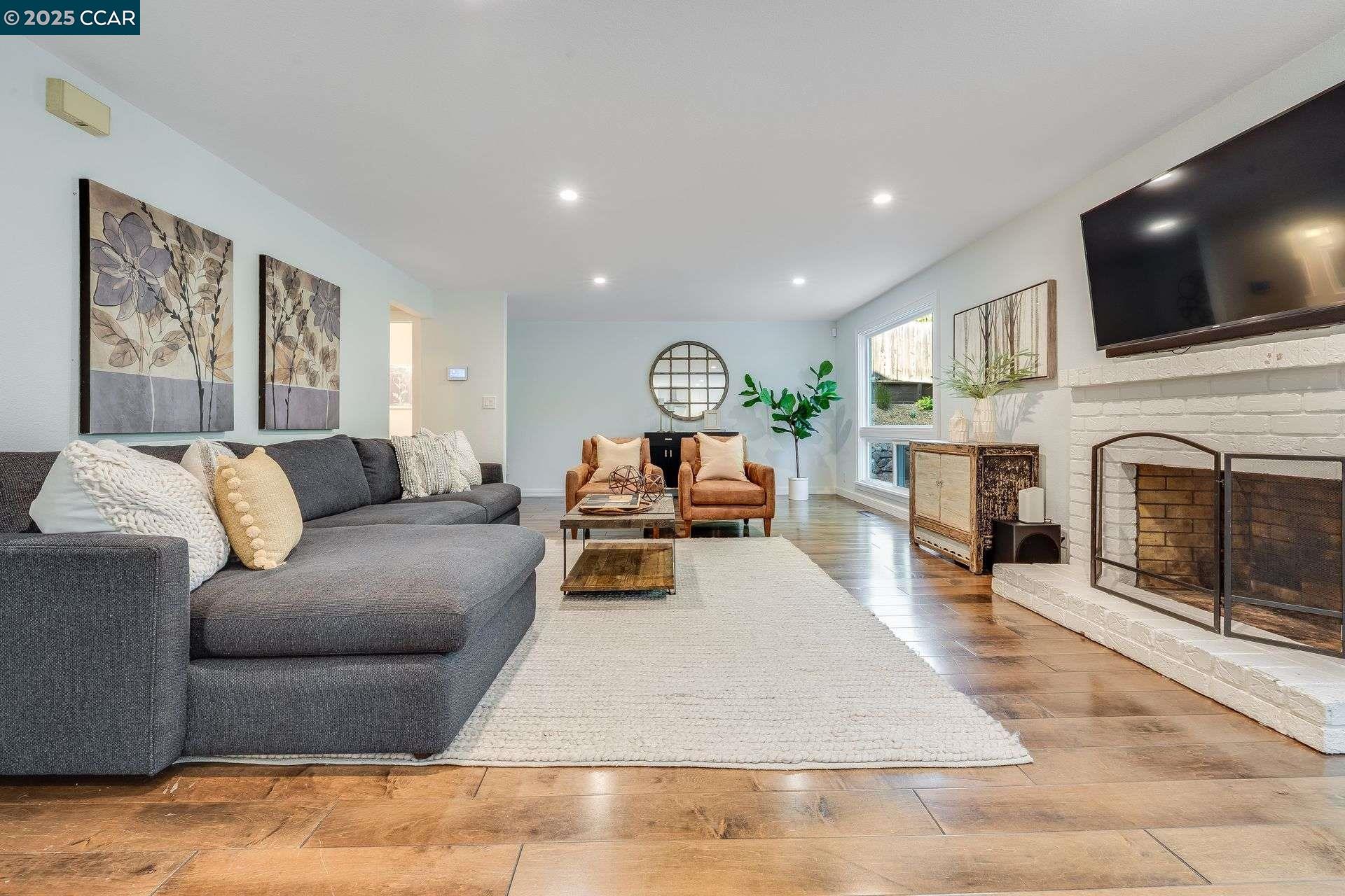 Beautiful new listing in Rudgear Meadows! No expense spared on this highly updated home that includes owned solar. Stylish Modern kitchen that features quartz counters w/tile backsplash, SS appliances, gas range, recessed lighting, under cabinet lighting & breakfast bar. The adjacent family room w/hardwood floors, recessed lighting & wood burning fireplace. The light filled formal living & dining room feature vaulted ceilings, recessed lighting, engineered wood floors & an amazing Napa inspired custom temperature-controlled wine cellar. A spacious primary bedroom w/double door entry, recessed lighting, ceiling fan & full bathroom w/dual sink vanities, walk-in closet & stall shower. There are 3 additional bedrooms & a beautifully remodeled bathroom w/two sinks & shower over bathtub. A fabulous entertainer's backyard has an outdoor grill, fire pit, custom covered patio, garden, lawn area & mini sport court all overlooking the open space & trails! So many great features that include a metal roof, owned solar, finished 3 car garage, whole house fan, dual pane windows, Central A/C, laundry room & downstairs 1/2 bath. Excellent Cul-de-sac location, adjacent to walking trails, Rudgear Meadows Pool & Rudgear park. Walnut Creek schools & Acalanes school district.