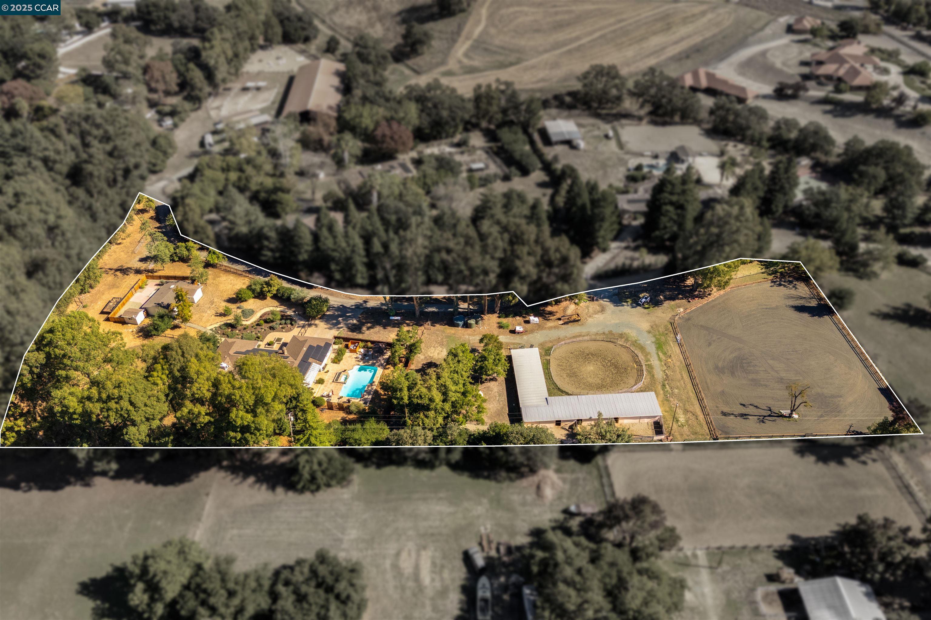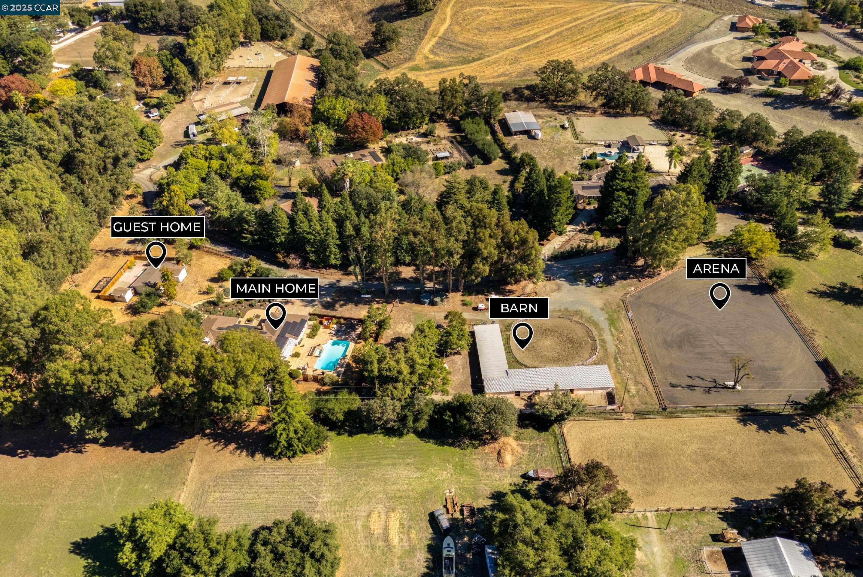 Luxury Meets Lifestyle in the Camino Tassajara Valley. Discover the best of Bay Area country living on 3.79 acres of flat, fully usable land in a private neighborhood where wide-open spaces meet everyday convenience. This move-in ready single-story home offers 4 bedrooms, 2.5 bathrooms, and 2,910 sq. ft. of thoughtfully designed living, plus a charming 2-bedroom, 1-bath guest house perfect for family, guests, or multi-generational living. 3925 total sq ft of living space. Equestrian enthusiasts will love the 8-stall barn with tack room, arena, round pen, and hot walker--everything needed for a premier horse lifestyle. Modern upgrades include 80 owned solar panels, Milgard windows, a gray water system, all-electric design, high-speed Wi-Fi, and a Tesla backup battery, blending sustainability with peace of mind. This property is also within the highly acclaimed San Ramon Valley Unified School District, celebrated for its top-rated schools. Here, you can enjoy the tranquility of country life while staying close to shopping, dining, and top Bay Area amenities. With spacious grounds, refined living, excellent schools, and complete equestrian facilities, this estate is a rare opportunity to have it all. https://listings.cre8r.agency/videos/019c3784-1595-72c8-84c1-3ccc4d2267d3